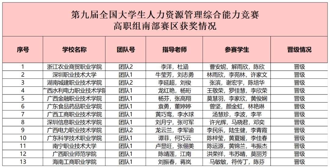 下午13:25,在參賽選手和指導老師的焦急等待中,大賽組委會本著公平、公正、公開的原則,統計并核算各參賽團隊比賽成績,獲獎名單如下。至此,第九屆全國大學生人力資源管理綜合能力競賽(高職組)南部區域賽圓滿落下帷幕。