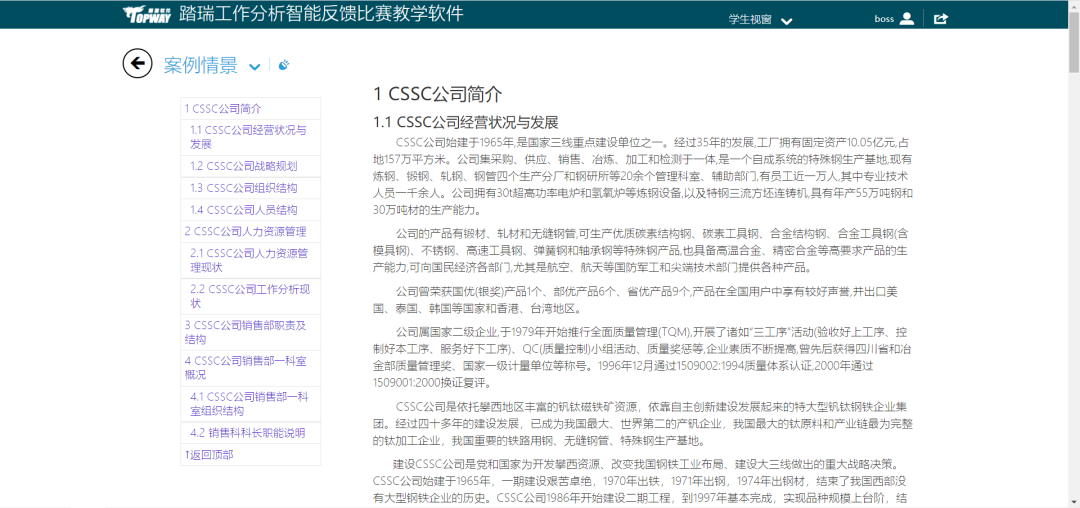 踏瑞工作分析智能反饋比賽教學軟件,包括工作分析的一般過程、問卷法、任務清單法、關鍵事件法、勝任力素質模型和工作說明書編制等內容。在每一具體的實驗流程中,軟件時刻秉承“所見即所得”的指導思想,在具體內容上積極探索情景模擬再現和多樣化的參與方式,在視頻、選擇和問答等傳統形式的基礎上探索了使用拖曳、flash和判斷等的新形式。