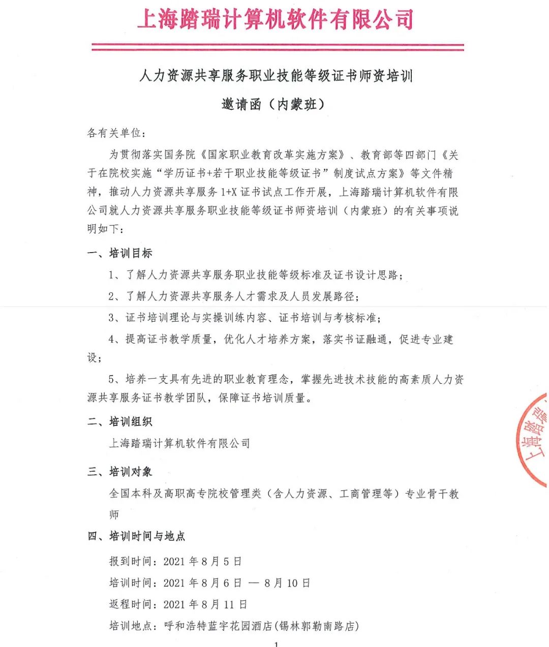 邀请函|踏瑞人力资源共享服务职业技能等级证书师资培训(内蒙班)
